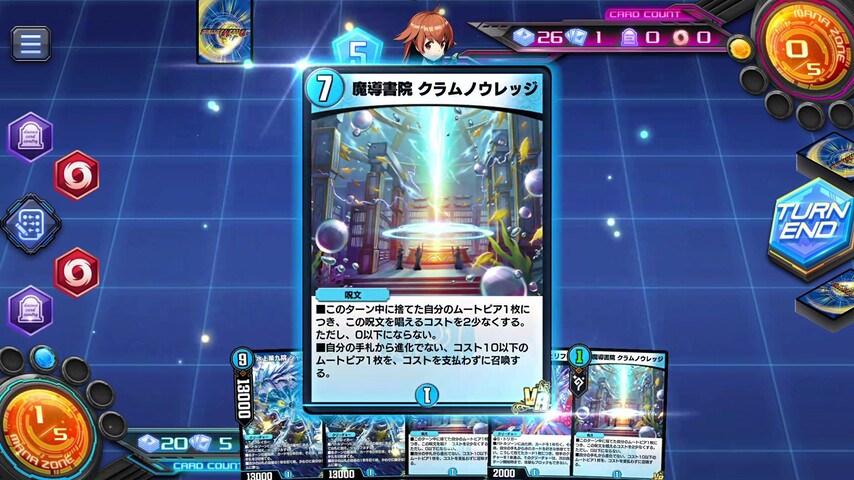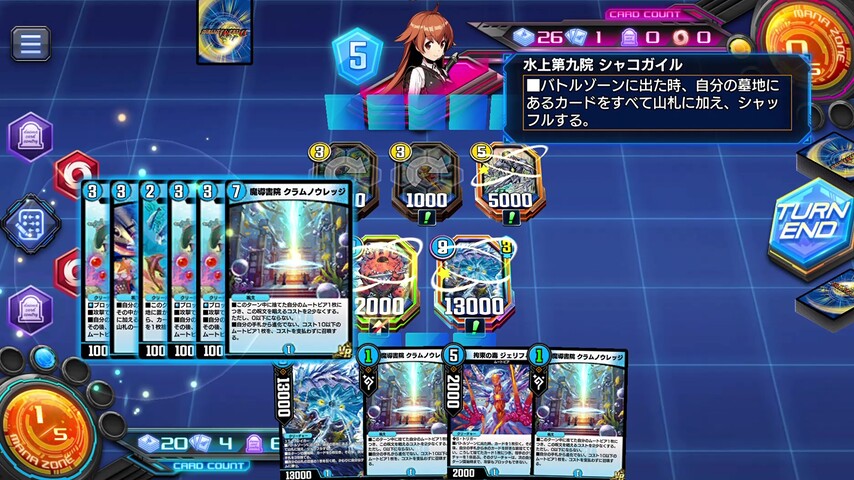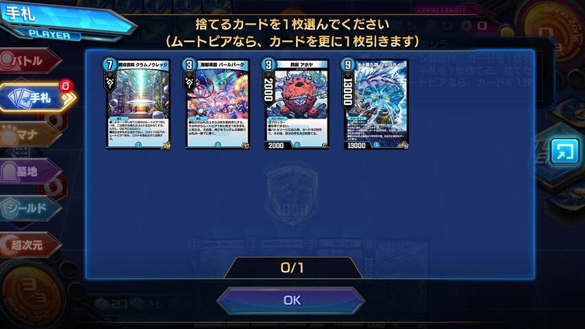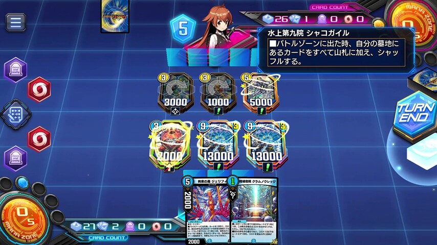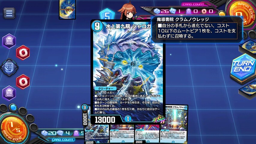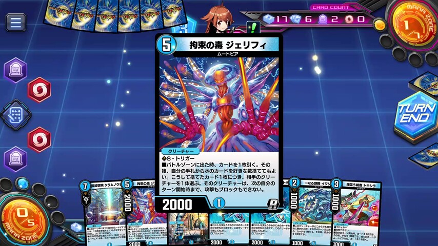あとは、《水上第九院 シャコガイル》の各ターンの5枚ドローとムートピアの手札補充を駆使して山札を掘り進めていきます。