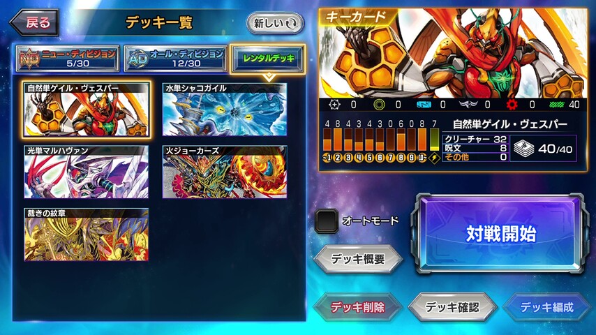 今回のレンタルデッキは、【自然単ゲイル・ヴェスパー】、【水単シャコガイル】、【光単マルハヴァン】、【火ジョーカーズ】、【裁きの紋章】となっています。