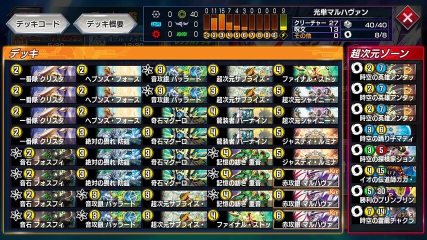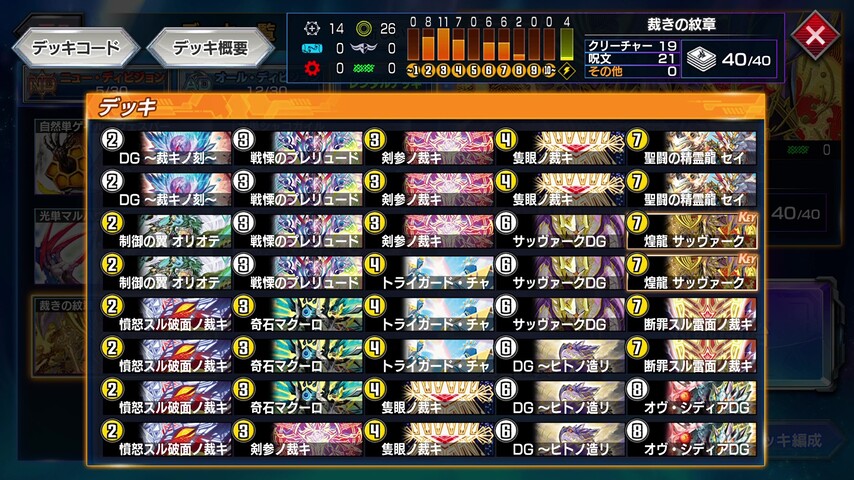 第32弾のマスター・カードの《サッヴァーク DG》と《煌龍 サッヴァーク》を切り札にしつつ新ギミックの「裁きの紋章」を主軸に据えたデッキ。