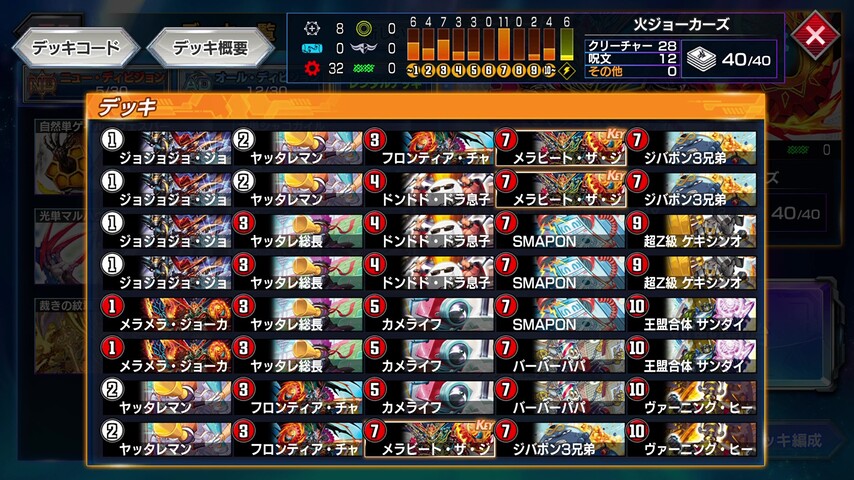 手札にそれらが無ければ《ジョジョジョ・ジョーカーズ》や第32弾で新しく登場した《メラメラ・ジョーカーズ》で山札を掘り進めて手札に加えたいところ。
