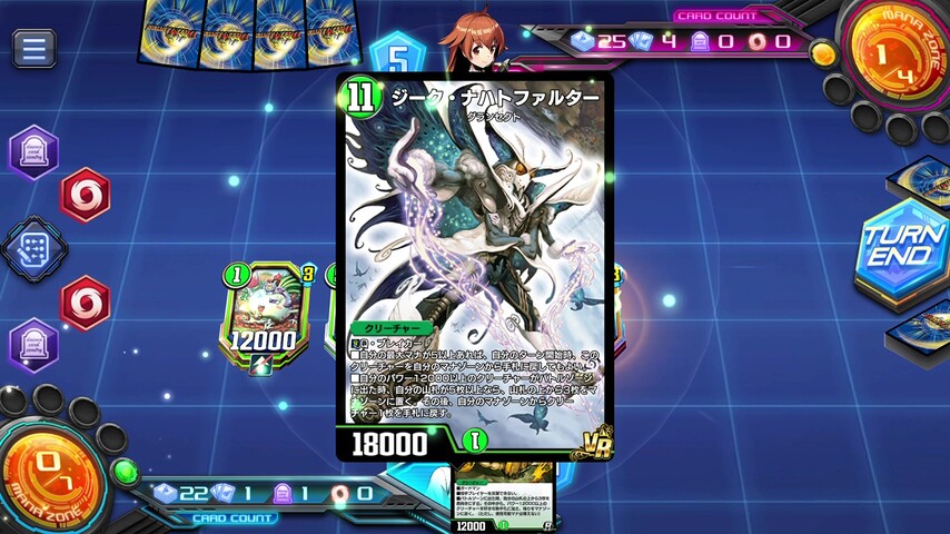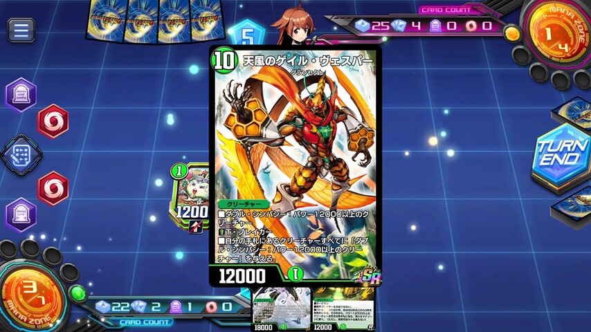 序盤から軽量パワー12000クリーチャーを並べ、コストの下がった《天風のゲイル・ヴェスパー》を召喚!