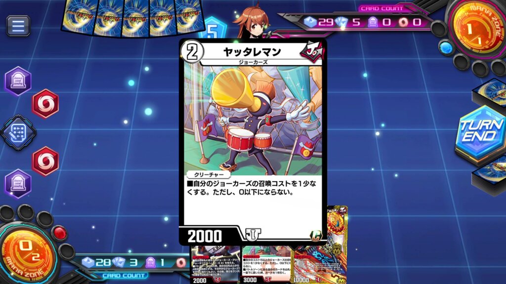 ジョーカーズ定番の《ヤッタレマン》などのコスト軽減クリーチャーを召喚していきましょう。