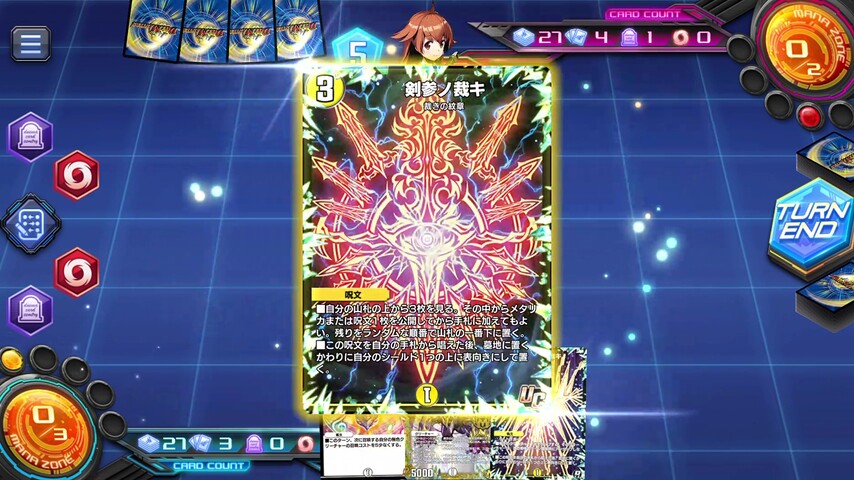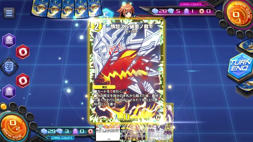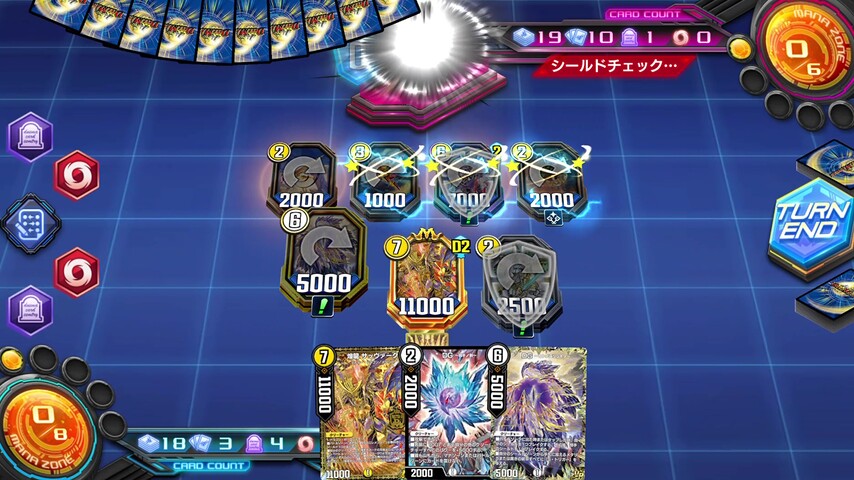 《憤怒スル破面ノ裁キ》や《剣参ノ裁キ》といった手札補充付きの裁きの紋章を唱えてシールドゾーンに表向きのカードを増やしていきます。