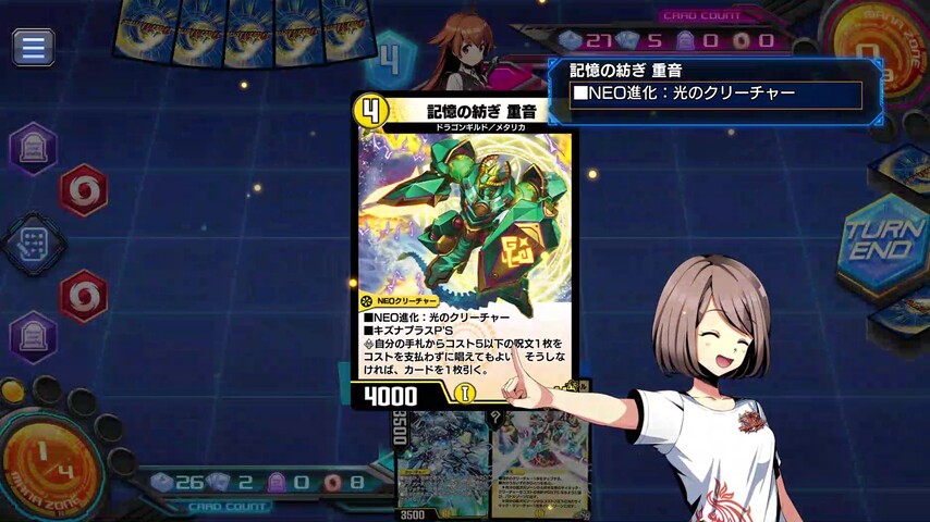 《記憶の紡ぎ 重音》のシールドブレイクでシールド差をつける事ができるため、次ターンに《雷電の覚醒者グレート・チャクラ》へと覚醒させられます。