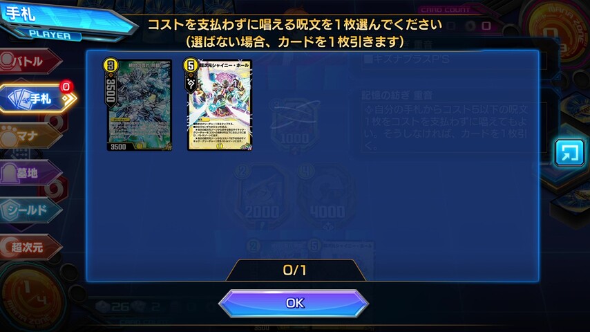 ・手札補充付きの裁きの紋章を唱えてシールドに表向きのカードを増やす。