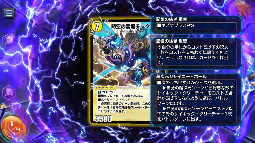 また、《奇石 クリスタ》から《記憶の紡ぎ 重音》に繋いで《超次元 シャイニー・ホール》を唱えれば3ターン目に《時空の雷龍 チャクラ》を降臨させる事ができます。