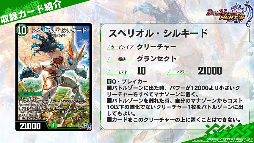 《スペリオル・シルキード》を進化元にする事はできませんが、パワー21000でQ・ブレイカーと基礎スペックが強力な上、離れた時能力の事を考えると《スペリオル・シルキード》から進化させるシチュエーションは非常に限定的でしょう。