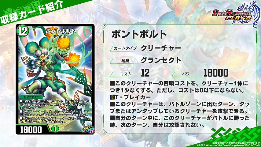 TCG版では、バトルゾーンに出たターンも相手のクリーチャーをタップもしくはアンタップを問わずに攻撃可能とする能力は「マッハファイター」というキーワード能力で呼ばれていましたが、《ボントボルト》の能力ではテキスト表記されています。