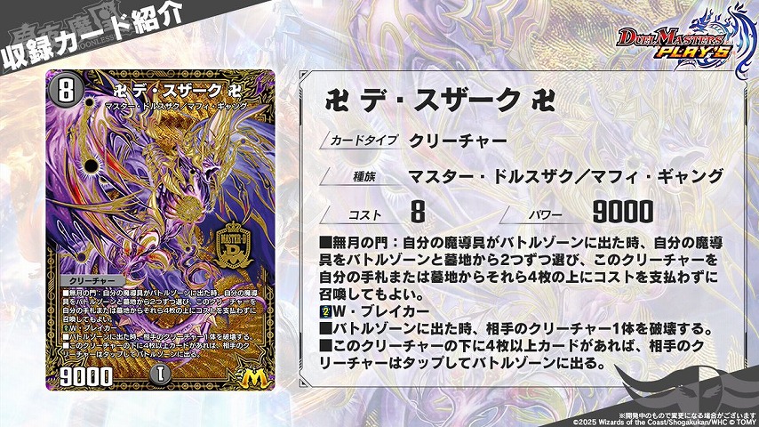 《追憶人形ラビリピト》の弱体化という懸念点はありますが、はたして《卍 デ・スザーク 卍》がどこまでデュエプレ環境で飛翔できるか楽しみですね。