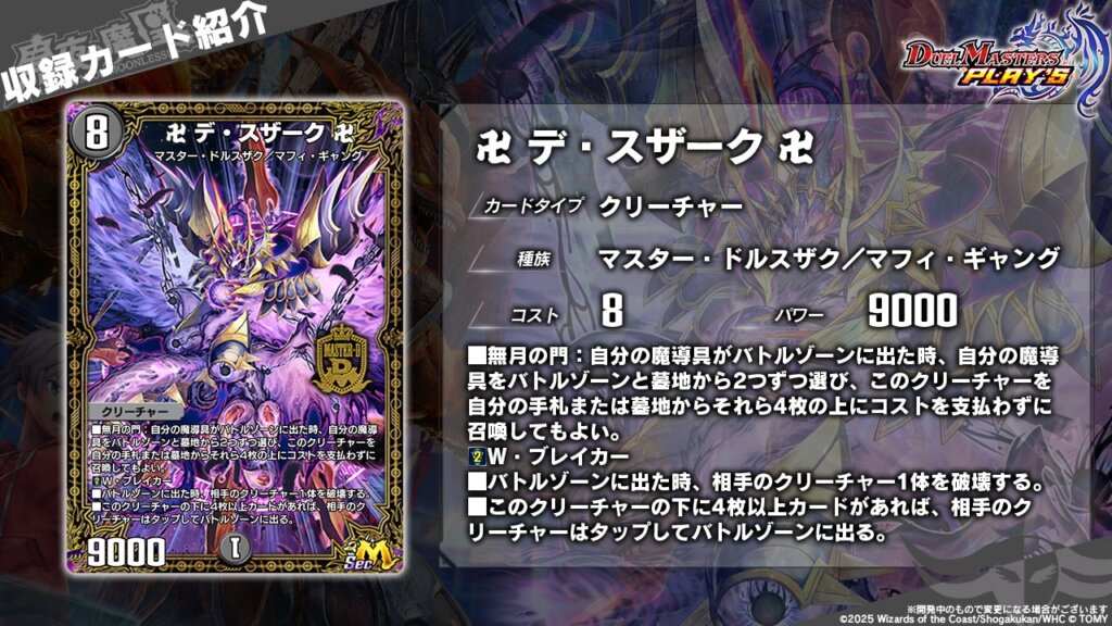 登場時能力で相手クリーチャーを1体破壊し、《卍 デ・スザーク 卍》の下にカードが4枚あれば(つまり、無月の門で召喚していれば)相手クリーチャーはバトルゾーンにタップインします。