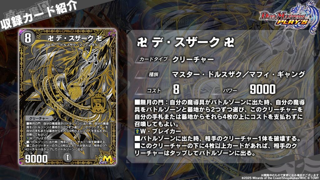 《追憶人形ラビリピト》の弱体化という懸念点はありますが、はたして《卍 デ・スザーク 卍》がどこまでデュエプレ環境で飛翔できるか楽しみですね。