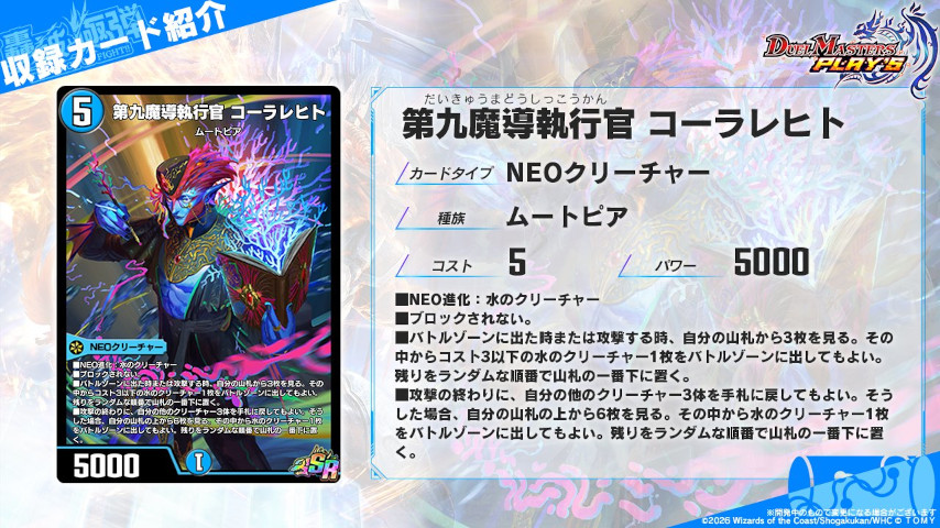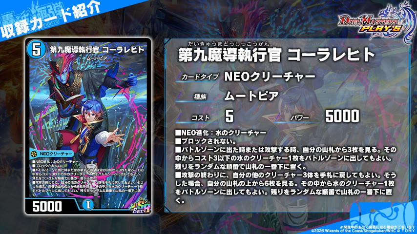 登場時と攻撃時に山札の上3枚を見て、その中からコスト3以下の水クリーチャーを1体タダ出し!