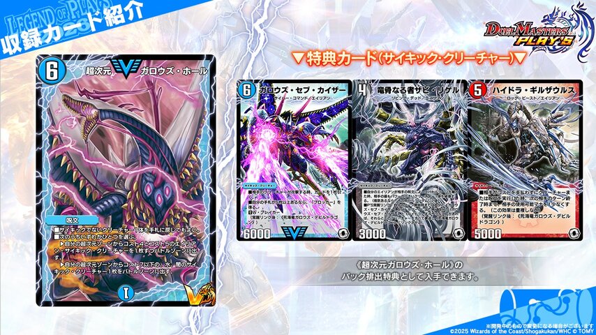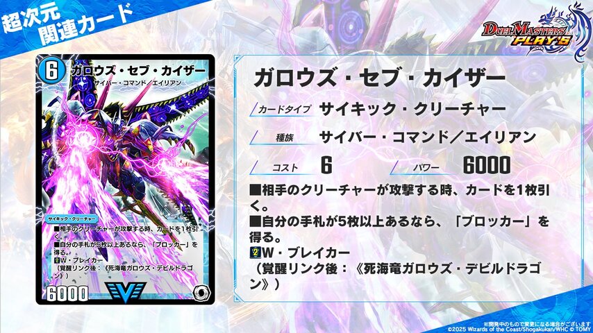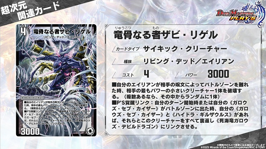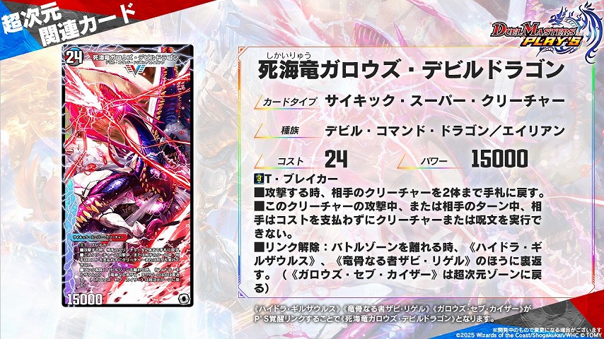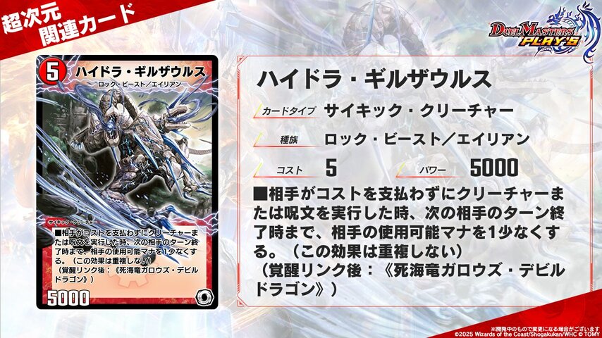「PLAY´S CHRONICLE PACKⅡ」で登場した《悪魔神王ディス・バルカミラ》は登場時能力でコスト6以下のサイキック・クリーチャーが呼び出せますが、《死海竜ガロウズ・デビルドラゴン》の再録によってNew Divisionのラインナップにそのリンク元が加わる事になりました。