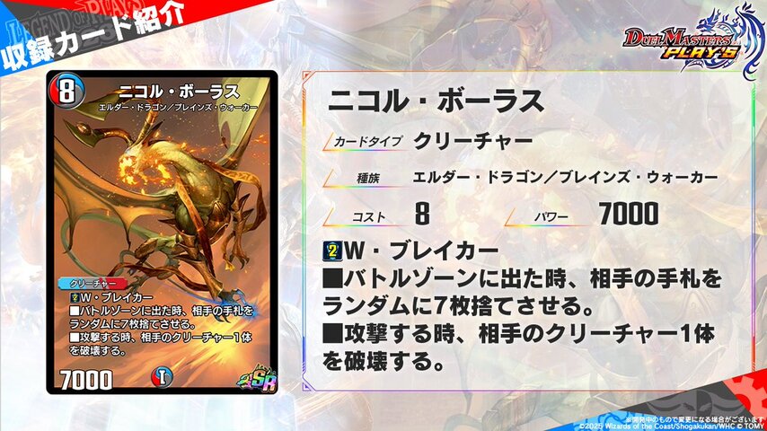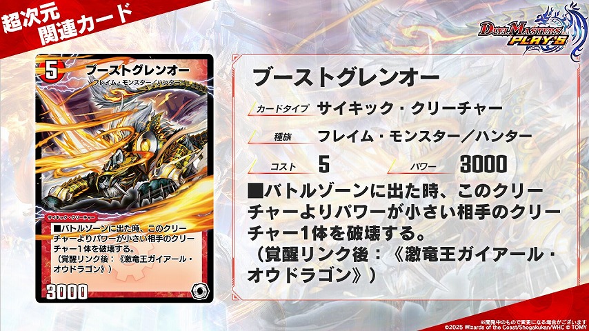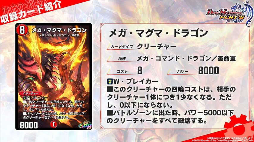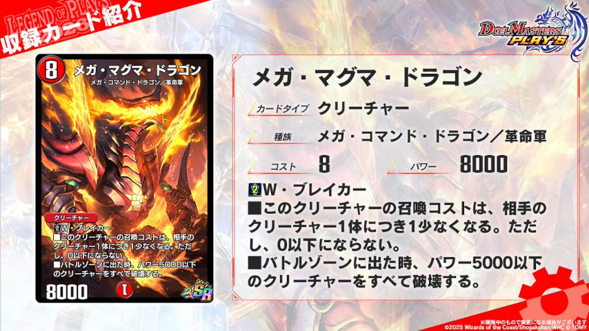 新章デュエル・マスターズ時代でもパワー25000よりも大きいクリーチャーは多くない(強いて挙げるなら禁断関係)ため事実上相手の全クリーチャー破壊となりますね。