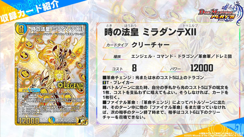 ただ、《時の法皇 ミラダンテⅫ》のファイナル革命が発動している間はGR召喚が一切不可能になるため、超GRの普及に邪魔になると判断されればその時は《時の法皇 ミラダンテⅫ》自身に(デュエプレ公式からの)「ジャッジメント・タイム」の裁きが下るかも……。