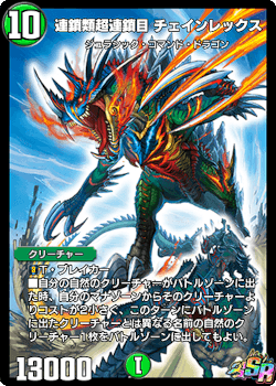 もちろん、《連鎖類超連鎖目 チェインレックス》自身も対象なので、《連鎖類超連鎖目 チェインレックス》⇒コスト8の自然クリーチャー⇒コスト6の自然クリーチャー⇒…といった具合に連鎖できます。