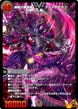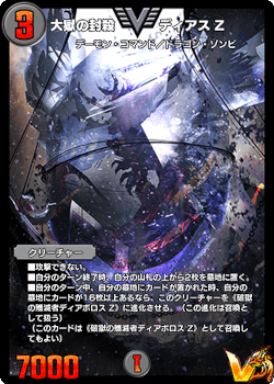 《大獄の封殺ディアス Z》面ではターン終了時に山札の上2枚を墓地に置き、自分のターン中に墓地の枚数が16枚以上になれば《破獄の殲滅者ディアボロス Z》へと進化!