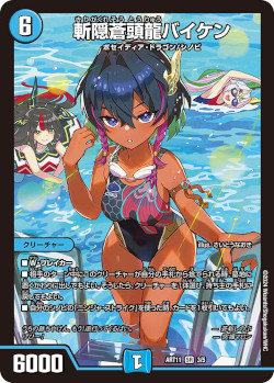 同じく、アオハル組に所属している「蒼斬しのぶ」の元ネタドラゴンである《斬隠蒼頭龍バイケン》もデュエプレに実装されておらず、代わりに《蒼神龍バイケン》というそっくりさんが実装されています。
