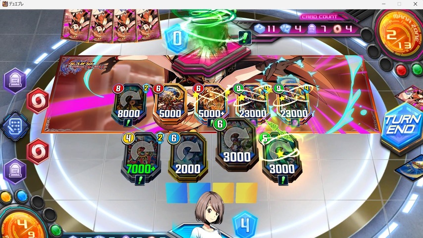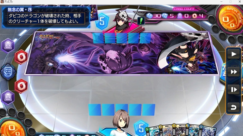 《霊騎コルテオ》で相手のドラゴンをタップしさらに、《開眼者シンラン》を進化速攻させてダイレクトアタックまでもちこみました。