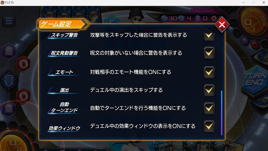 「ゲーム設定」の「演出:デュエル中の演出をスキップする」のチェックボックスにチェックを入れます。
