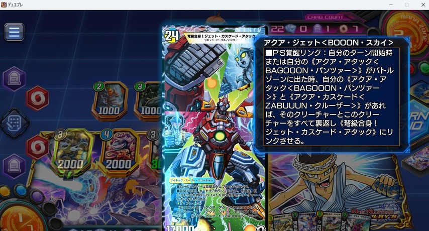 | P’S覚醒リンク:自分のターン開始時または自分の《アクア・アタック<BAGOOON・パンツァー>》がバトルゾーンに出た時、自分の《アクア・アタック<BAGOOON・パンツァー>》と《アクア・カスケード<ZABUUUN・クルーザー>》があれば、そのクリーチャーとこのクリーチャーをすべて裏返し《弩級合身!ジェット・カスケード・アタック》にリンクさせる。 |