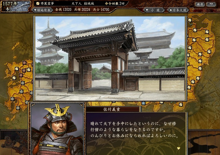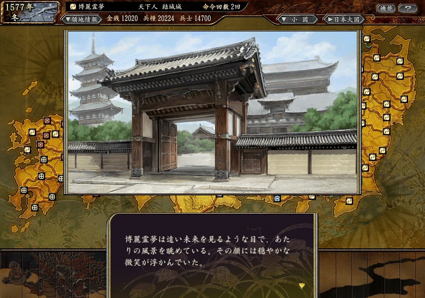 さて、話を戻しますと、ゲーム上は天下統一を成し遂げたものの、上杉、龍造寺、島津といった大勢力が戦力を温存したまま残っており、さらに、博麗家は依然として朝敵扱いのまま……。